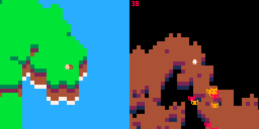 Both entries utilise the same basic world generation methods I've used in this previous cartridge, but the latter features a more EXTREME colour palette and INTENSE GAMEPLAY involving flying SKULLS.